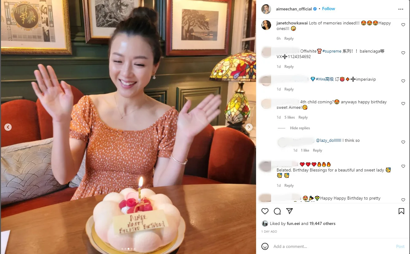 With the recent relaxation of Hong Kong’s pandemic regulations, Aimee was spotted celebrating her belated birthday party with friends, complete with a dazzling grin, cake, and flowers, while looking joyful to be surrounded by loved ones.