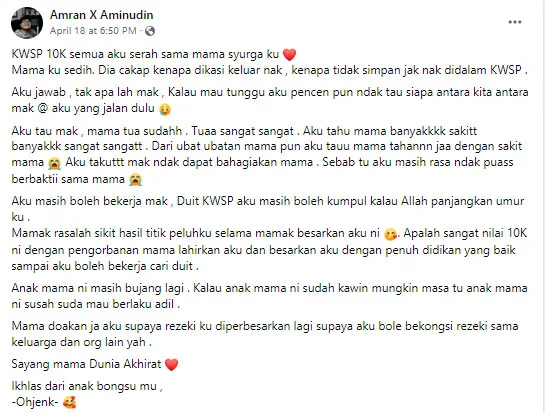 Amran Aminudin recently took advantage of the special withdrawal from his Employees’ Provident Fund (EPF). With some planning, he had decided to take out RM10,000 from his fund and gifted it to his mother (64). Amran shared that he had gotten the idea once the government made the announcement about the special withdrawal.