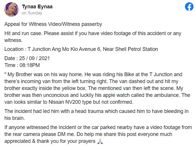 The motorcyclist, named, Muhammad Fitri, fell off his bike after colliding with a van at Ang Mo Kio and while lying on the ground, he saw the vehicle drive off before losing consciousness,. The accident occurred at the junction of Ang Mo Kio Avenue 6 and Ang Mo Kio Street 31 on the evening of 25th September.