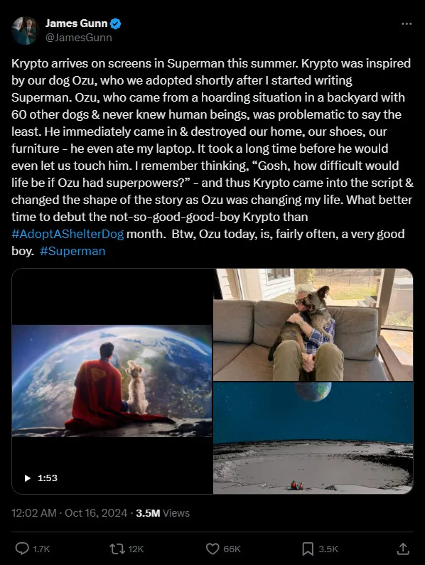 Gunn posted the official motion photo of the up-coming film on X – including a comic panel which serves as the inspiration for the motion photo, and an image of Gunn and Ozu. In the same post, Gunn reveals the reason for the heroic canine’s inclusion to the story.