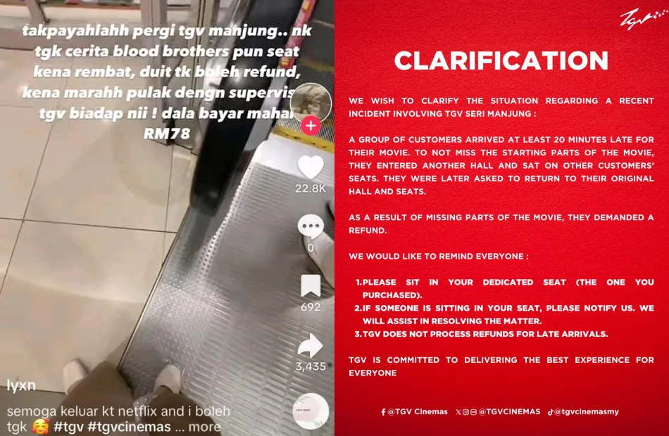 For context, a TikTok user who goes by @/lyxn claimed they went to see Blood Brothers at the AEON Seri Manjung TGV Cinemas outlet in Perak. According to the user, their seats had been taken, and they were unable to get a refund for their RM78 tickets from the cinema. They also alleged that a supervisor scolded them rudely. The video has since gone viral, with many viewers asking for more details about the incident.