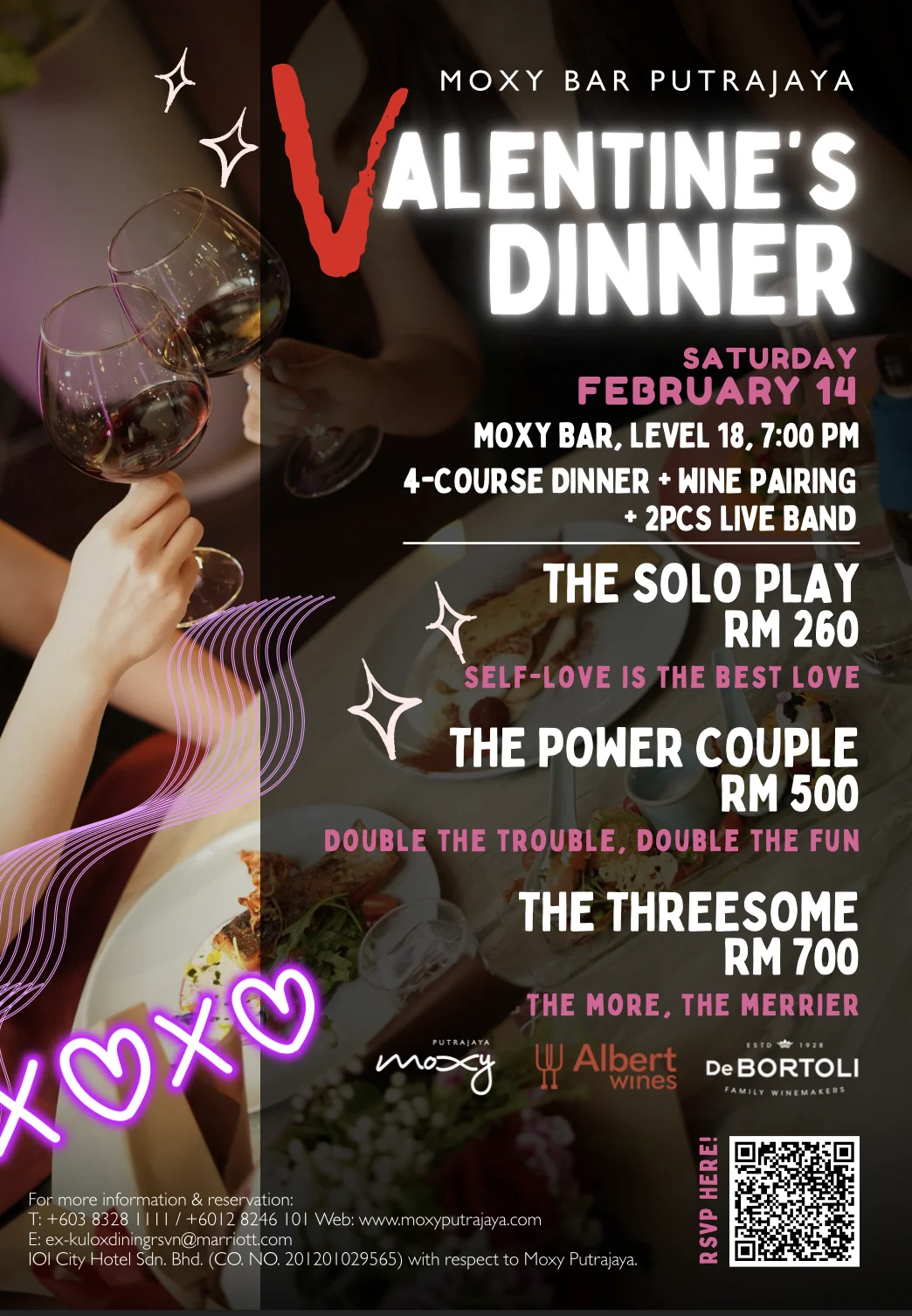 This Valentine’s Day, Moxy Bar Putrajaya invites guests to celebrate love in all its forms with a specially curated four-course Valentine’s dinner, complete with wine pairing and live band entertainment, taking place at Level 18 from 7pm. Designed to take diners on an emotional and sensory journey, the Valentine’s menu tells a story — from first spark to lasting connection. Each course is thoughtfully crafted to evoke different feelings, allowing guests to fully immerse themselves in the experience from the first bite to the final dessert.