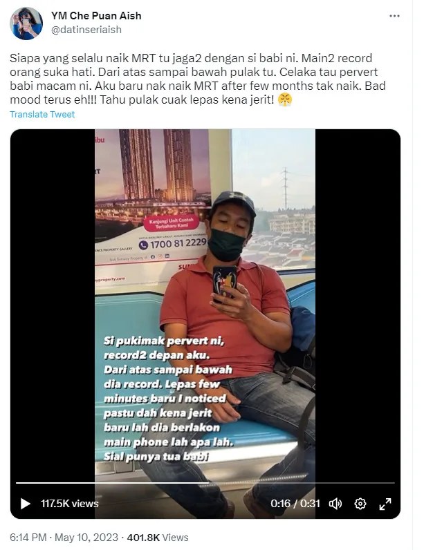 “Whoever usually takes the MRT should be careful with this pig, recording people as he likes. From top to bottom too,” Twitter user YM Che Puan Aish said scathingly. She also included a video of the man in question, dressed in a red collared shirt and jeans while wearing a mask and a cap.