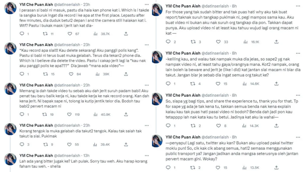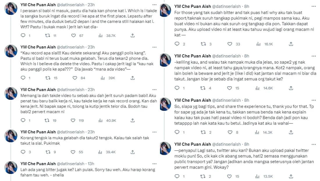 Netizens later apparently reprimanded Twitter user YM Che Puan Aish for publicising the matter instead of reporting it. However, she clarified that her post was not to catch the man. “If (people) see (him), then they will be aware and can scream at him (like I did) so (he) will be scared,” she stated.