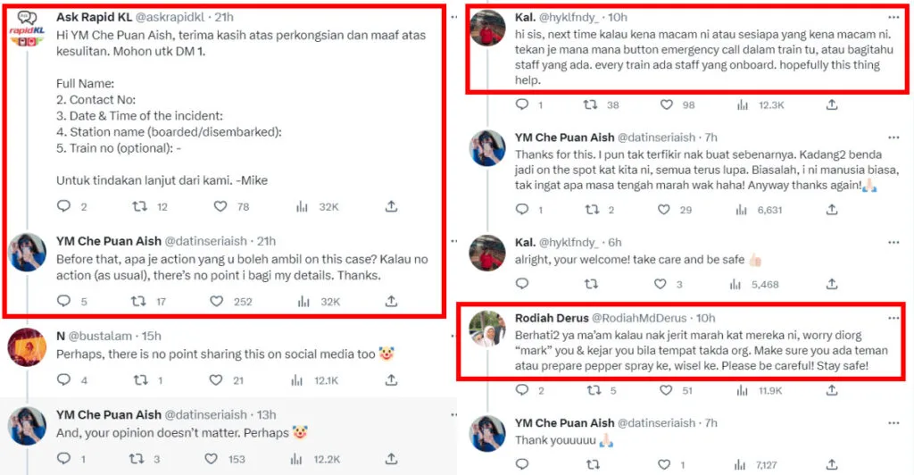 Another netizen however advised her to press the emergency call aboard the train or to let train staff know if such an incident happens again. “Every train has staff onboard,” they said. Others also advised her to have someone or pepper spray with her in the future. “(I’m) worried they might ‘mark’ you or chase you when there’s no one around,” one said. “Please be careful! Stay safe!”