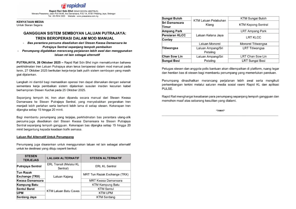 While investigation and repair works continue, a free shuttle bus service is being provided between Kwasa Damansara Station and Putrajaya Sentral Station to assist passengers. The bus service frequency is every 15 to 20 minutes, depending on traffic conditions. Commuters are advised to plan their journey, consider alternative routes and check the Rapid KL social media pages and PULSE app for the latest updates.