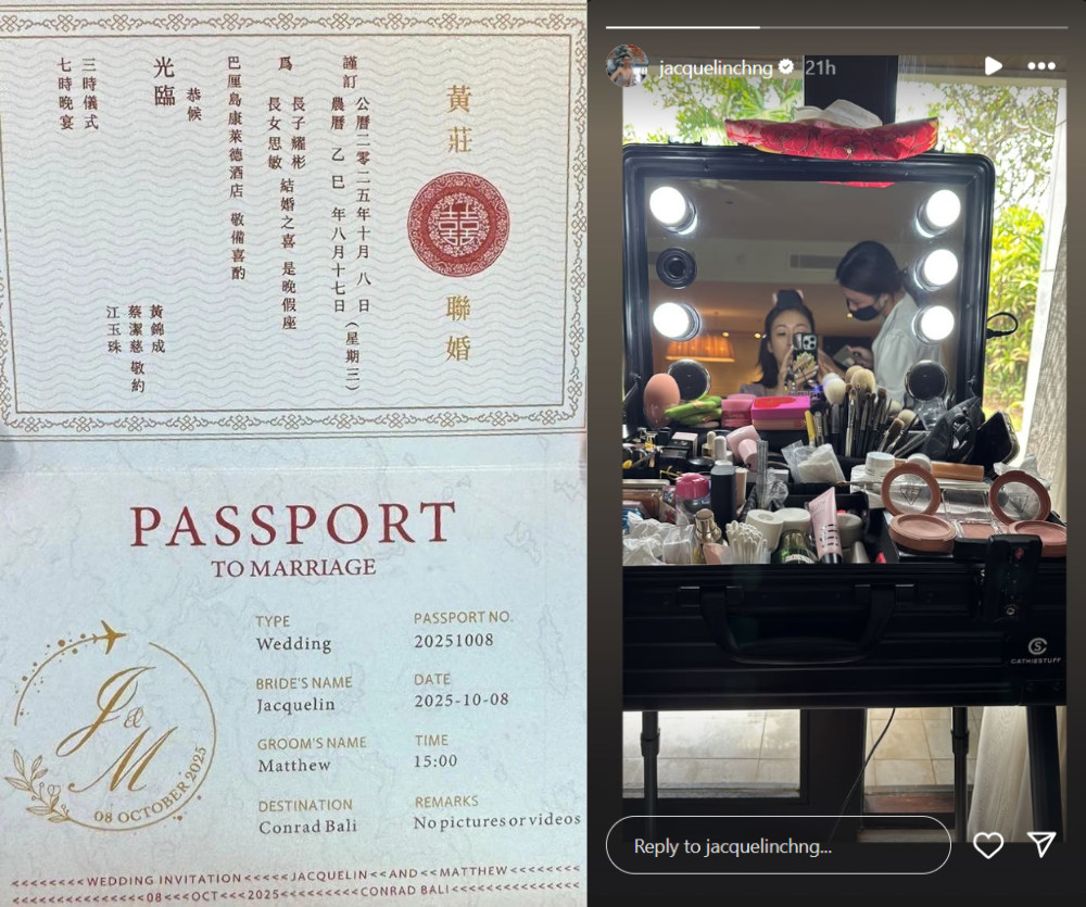 News outlets have reported that Jacquelin and her boyfriend, Matthew Wong (黄耀彬), tied the knot on 8th October 2025 (Wednesday). A leaked image of the wedding invitation reveals that the ceremony was held at the Conrad Bali hotel. The event also had a strict no-camera policy, likely to protect the couple’s privacy. However, Jacquelin did share a glimpse of the ceremony, posting a photo of her getting ready to exchange vows.