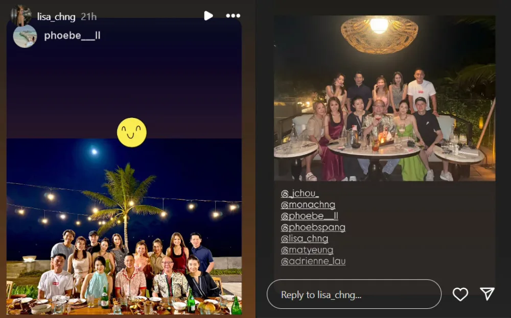 While the wedding was an intimate affair, the guest list had some familiar faces besides the bride and groom’s family members. Hong Kong actor Mat Yeung (楊明), who is dating Jacquelin’s sister Lisa (莊思明), was also in Bali during the wedding day, alongside Hong Kong actress Myolie Wu (胡杏儿) and her husband, Philip Lee. Chinese-American singer Adrienne Lau was also spotted in a photo with the other stars.