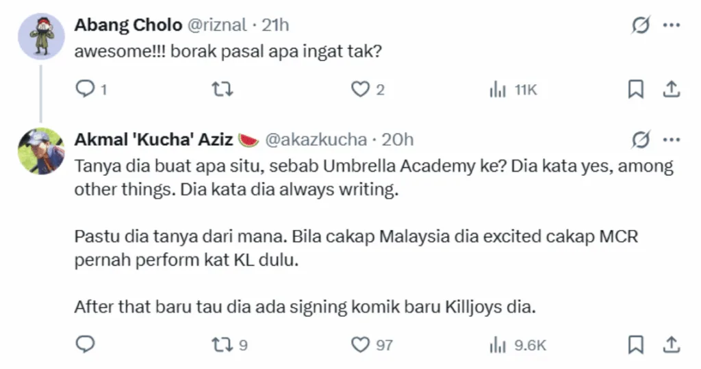 Akmal also shared a photo he took with Gerard at the event. Responding to comments, the Malaysian revealed what the group chatted about with the singer. The comic artist explained that Gerard was at SDCC to promote his two comic book series, “The Umbrella Academy” and “The True Lives of the Fabulous Killjoys”. During the same event, the musician also held a signing for “Killjoys”, which he recently released.