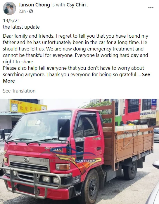With everyone working hard to do what they could, Janson soon reported that his father had been found. Apparently, he was discovered in his lorry in Bukit Puchong. Sadly, by the time they found him, he had already passed away. Janson thanked the people for helping, but as they are now preparing for his father’s funeral, he is hoping the public can give them space.