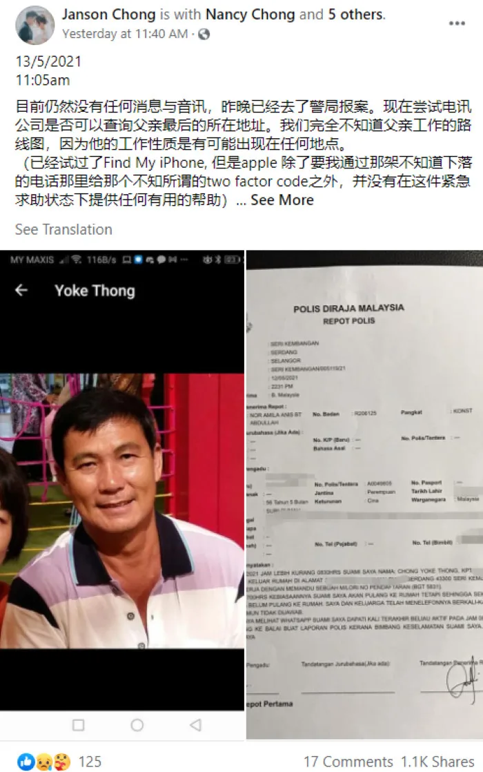 On 12th May, Janson posted on his Facebook asking for help. He reported that his father, Chong Yoke Thong, had been missing for several hours. “My father went out at 8am to deliver things for work,” he wrote. “Normally, he would be back by 5pm or latest by 7pm. However, he is missing now and we are unable to contact him by phone.” Janson said this was the first time his father has been uncontactable in a decade. They have contacted several hospitals but did not receive news of him. They also tried tracking his phone but were confounded by the device’s failsafe.