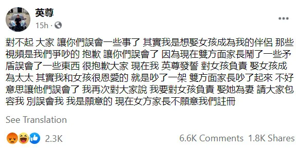 Early this morning, the young man himself posted about the matter on Facebook. He explained there was a misunderstanding and he actually intended to marry his girlfriend. “We are normally very loving, but our argument caused some misunderstandings.” However, her parents no longer approve of the two getting married. His words were refuted by someone claiming to be the girlfriend’s brother.