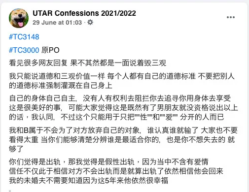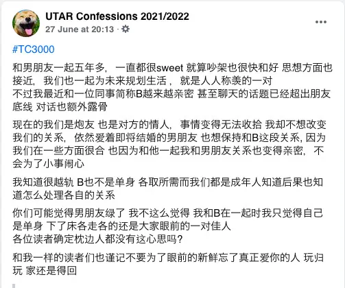 Recently, a woman took to the Facebook page “UTAR Confessions 2021/2022” to confess that she’s been cheating on her soon-to-be husband. In her post, the woman detailed her one-way open relationship.