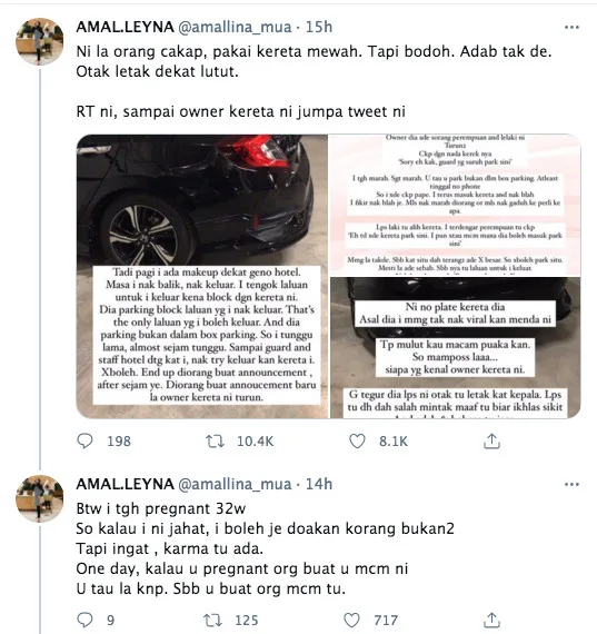 In a tweet that has gone viral, Twitter user @amallina_mua wrote, “There are people who are rather foolish despite driving a fancy car. This sort of person has no brains and manners at all.”