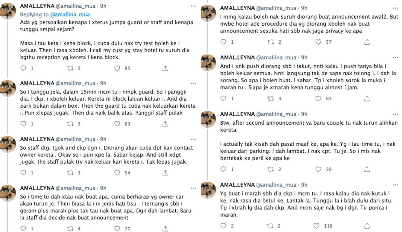 She continued, “So I waited a long time, for almost an hour. After that, the hotel guard and staff approached me and offered to help. However, my car was still stuck. They ended up making an announcement; after an hour. The owners of the car then came to the parking lot after they made the announcement.”