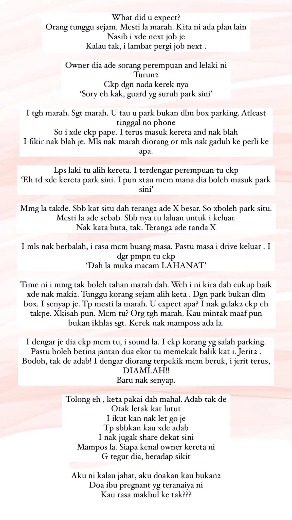 Amallina then revealed that she “couldn’t contain my anger anymore” after she heard the lady call her “Lahanat” (Malay offensive slur). She explained, “I was being considerate enough to contain my anger. I even waited an hour for them. They were in the wrong for parking their car outside the box. But still, I remained silent about it. Of course, her remark pissed me off. How did they expect me to response, then? Did they expect me to just laugh about it and say ‘Everything’s fine, it’s okay,’ just like that?”