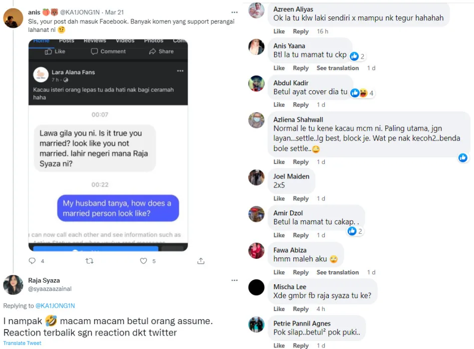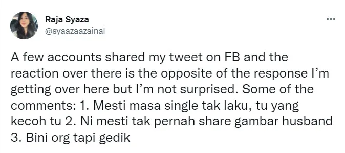 Another social media user known as Anis (@KA1JONG1N) told Syaza that her post had also made its way on Facebook. However, much to her surprise, she found that most of the comments left by FB users were supporting the man. “They made a lot of assumptions. The reactions on FB are far more different as compared to on Twitter,” Syaza remarked.