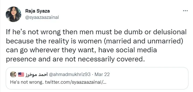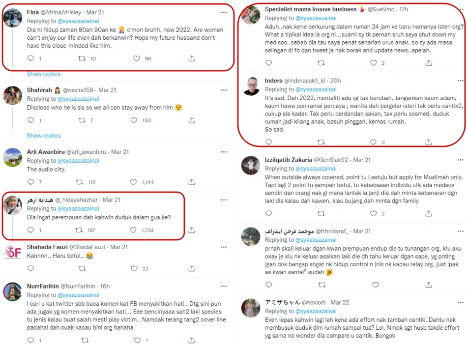 Now that Syaza’s tweet has gone viral, the comments have been flooded with netizens putting the man on blast. One user, Fina (@AfrinaAfrisley), commented, “Is he living in the 80s or 90s? Come on now bruh, it’s 2022. Can’t women (be) themselves even after getting married? I hope my future husband won’t have a narrow mindset like this guy.”