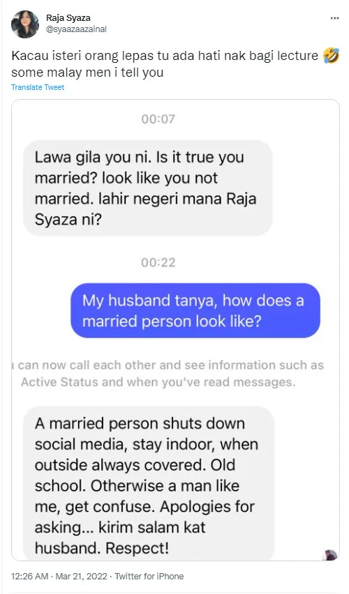 Instead of apologising for his action, the man decided to “lecture” Syaza. After receiving her response, he replied, “A married person should (close all social media accounts), stay indoors, cover themselves when going out. (I’m an) old school, otherwise men will get confused. My apologies for asking. Send my regards to your husband.”