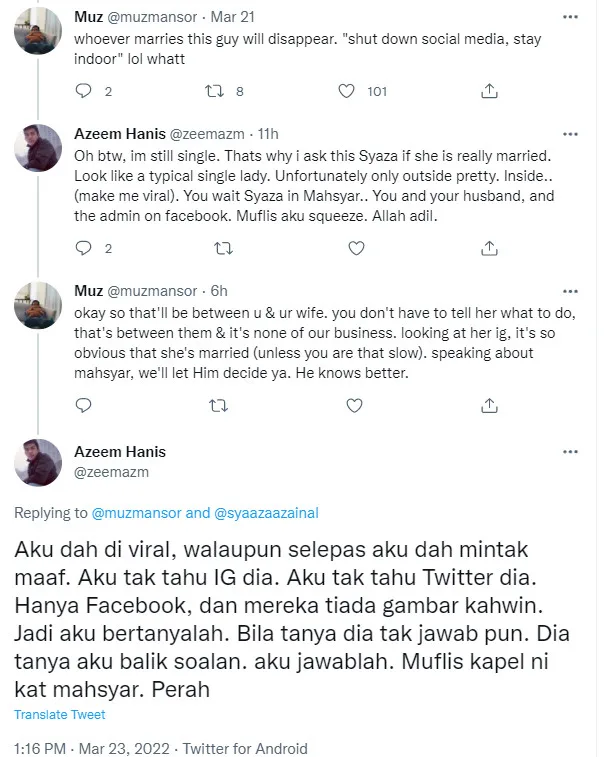 Azeem also claimed that he had already apologised to Syaza. He then said, “I didn’t know her IG and her Twitter. I only knew her FB. She didn’t post any photos with her husband (online), that’s why I asked. When I popped the question, she didn’t reply. She then responded with another question, so I answered,” adding that he didn’t expect to go viral after Syaza uploaded the photo of their text messages on her Twitter.