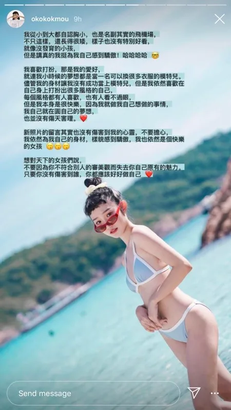 In most of the photos uploaded on her Instagram, Madeleine, widely known as Okokokmou (Ok毛) among her loyal fans, can be seen striking her pose while wearing several pieces of revealing swimwear with the crystal clear sea behind her. Because of that, the comments section on her Instagram has been flooded with local internet trolls poking fun at her boob size.