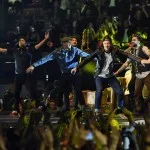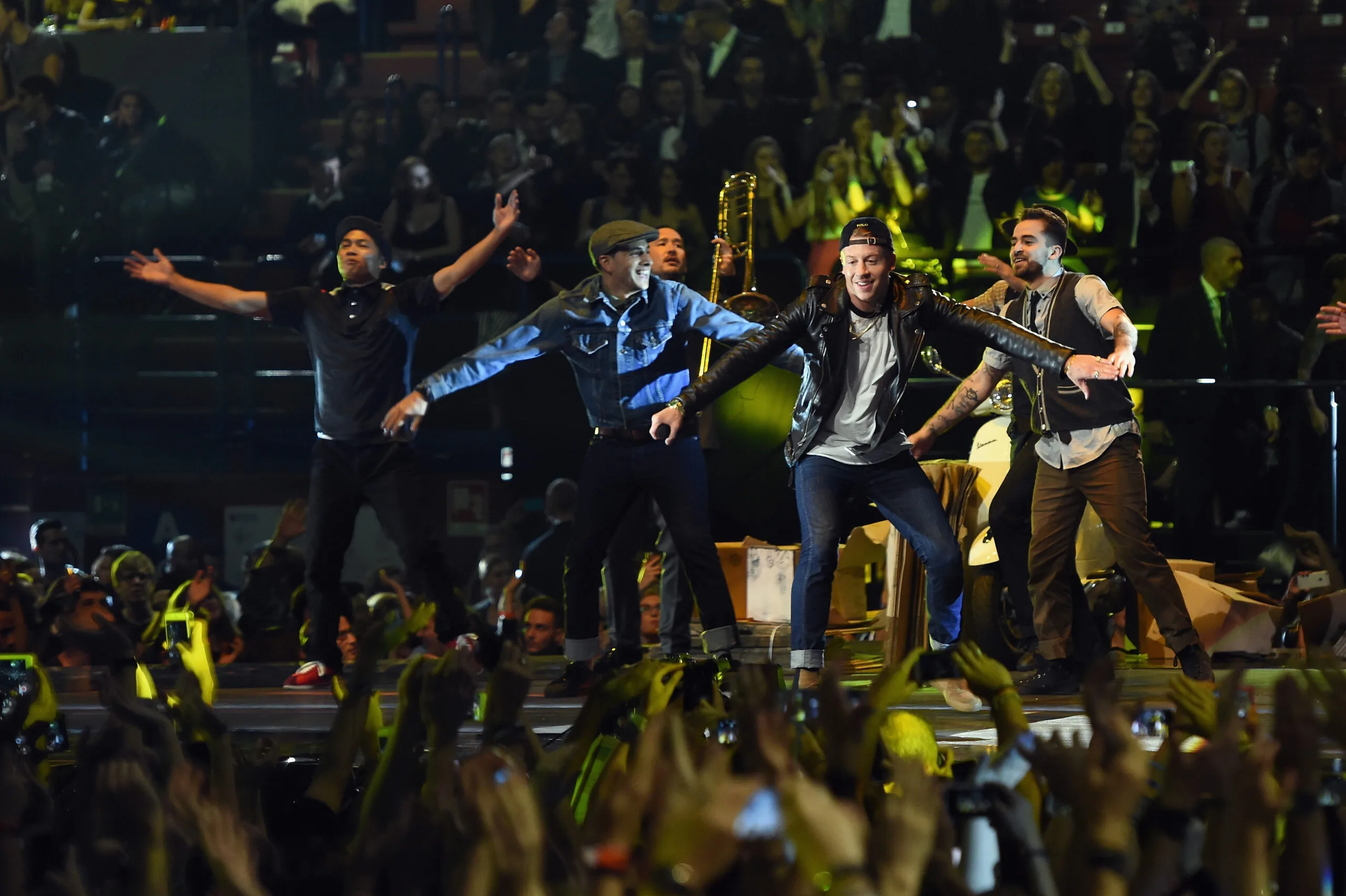Macklemore and Ryan Lewis opened the show with a high-octane performance of “Downtown”, their award-winning song which featured mopeds, travellators, and Eric Nally flying high above the stage. Later in the evening, they won “Best Video” for the song.