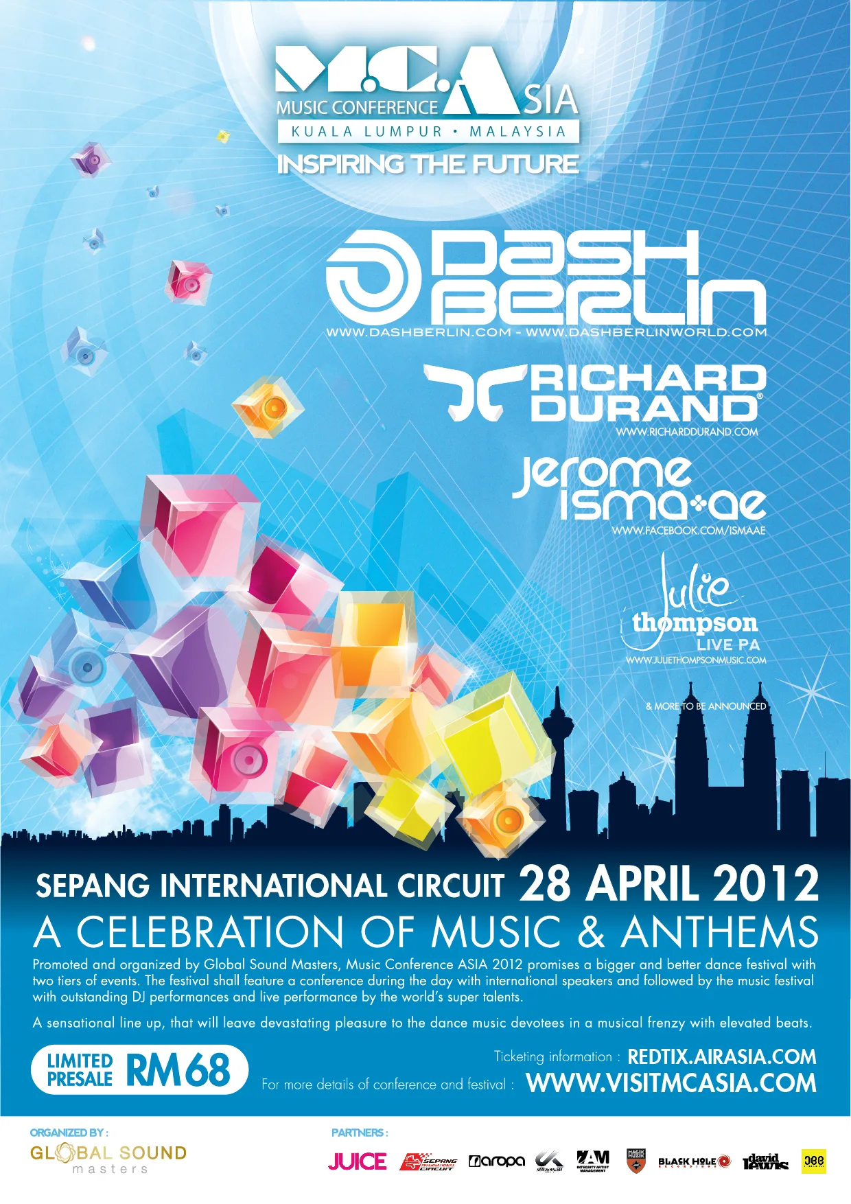 Promoted and organized by Global Sound Masters, Music Conference ASIA 2012 promises a bigger and better dance festival with two tiers of events. The festival shall feature a conference during the day with international speakers and followed by the music festival with outstanding DJ performances by the world’s super talents.