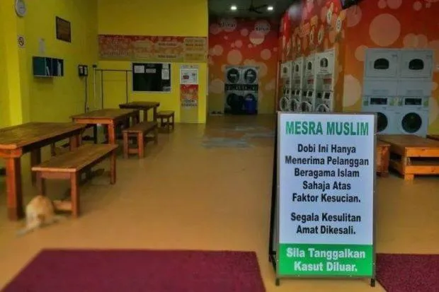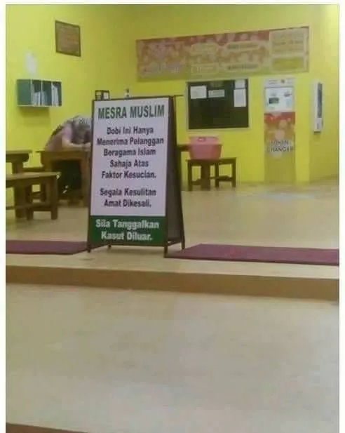 The self-service launderette in Muar, Johor, first drew attention for placing an “Only For Muslims” signage at its entrance. The sign read, “Dobi Ini Hanya Menerima Pelanggan Beragama Islam Sahaja Atas Faktor Kesucian” (Translation: This launderette only accepts customers who are Muslims due to the sanctity factor). It also asks customers to remove their shoes before entering the launderette.