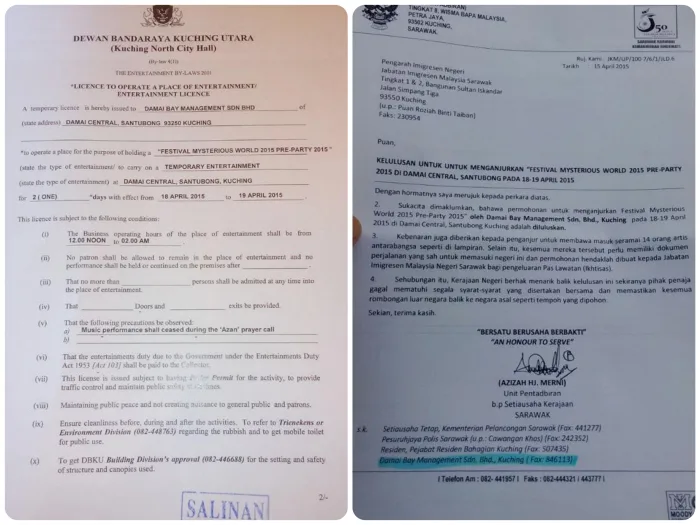 According to the official Mysterious Fest Facebook page, Mysterious Asia Sdn Bhd and Damai Bay Management Sdn Bhd (the venue) had obtained all necessary permits and approvals for the show together with support from relevant authority. However, 4 hours before the “Mysterious World Pre-Party 2015” event’s gates were to open to excited partygoers, the organisers received a letter from Sarawak Chief Minister Department by hand, which stated that the approval had been revoked at the last minute.