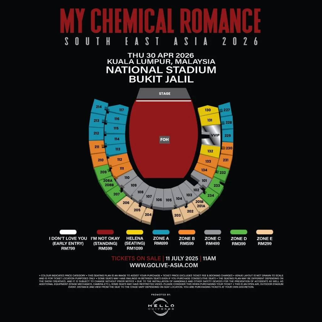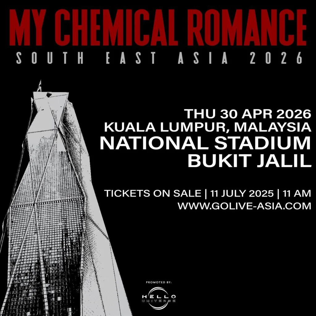 On Monday morning (7th July 2025), MCR dropped the Asian tour dates announcement through their social media pages. The tour begins in April 2026 and includes stops in Seoul, Bangkok, Bulacan, Singapore, Jakarta and Kuala Lumpur. The band will perform in KL on 30th April 2026 (Thursday) at the National Stadium Bukit Jalil. Ticket prices range from RM299 to RM1,099.