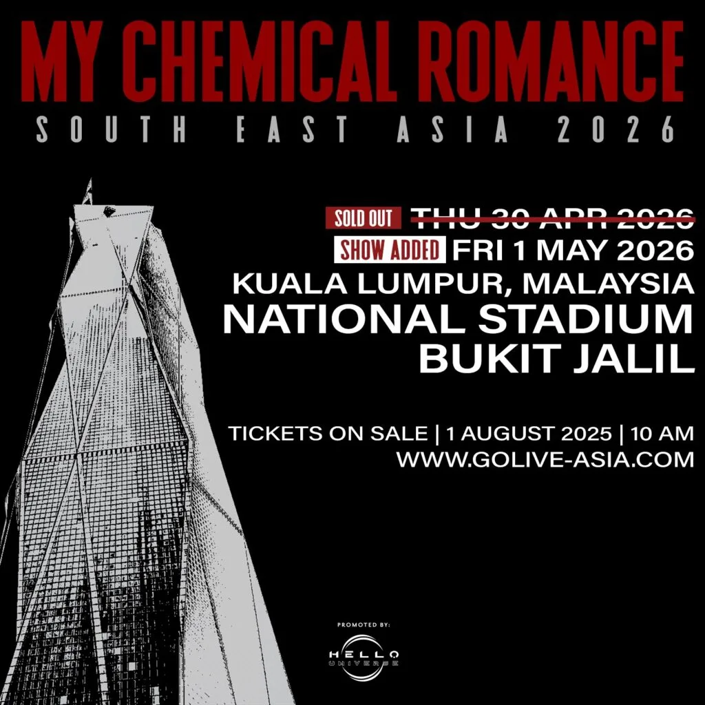 After selling out their upcoming concert in Kuala Lumpur, American band My Chemical Romance (MCR) is adding another show! Their second concert is set for 1st May 2026 (Friday) at Bukit Jalil National Stadium!