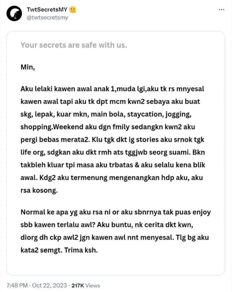 In an anonymous posting on the Twitter account TwtSecretsMY, a Malaysian man shared how he feels about marrying early. In the post, the man said he married early and had a child but clarified that he doesn’t regret his marriage.