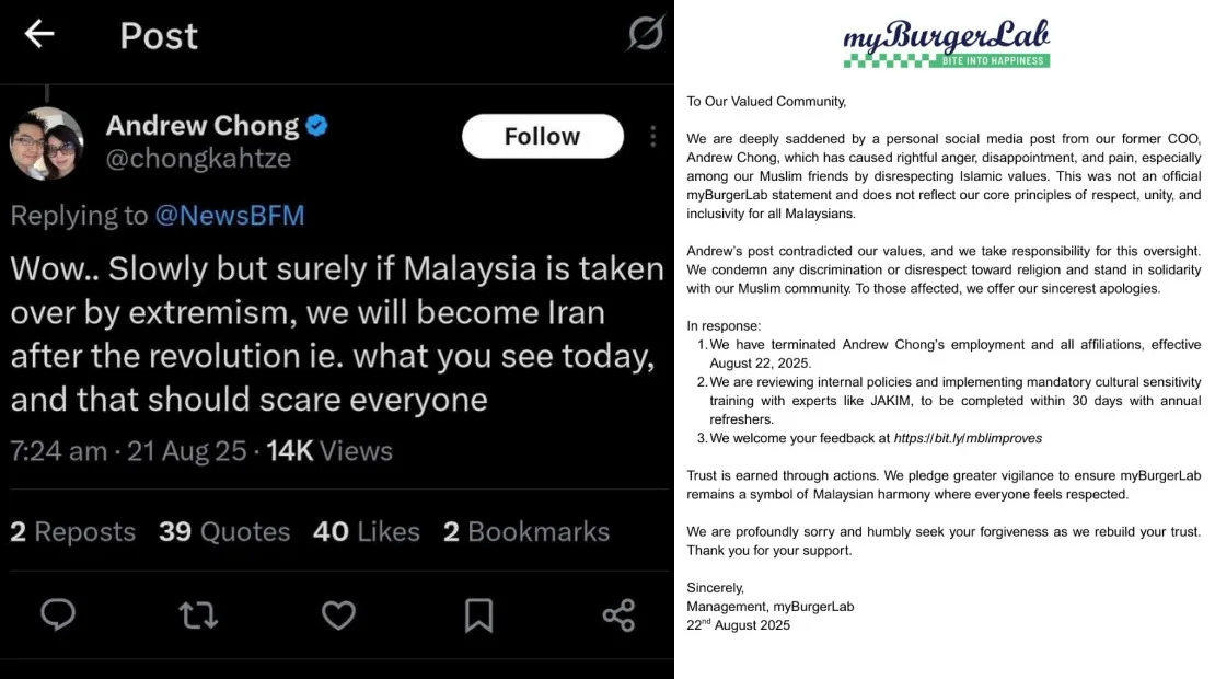 After the post went viral, myBurgerLab faced heavy backlash, with many customers expressing disappointment over the COO’s remarks. Some even called to boycott the burger chain. The brand has since issued an official apology and announced that Andrew Chong has been removed from the company.