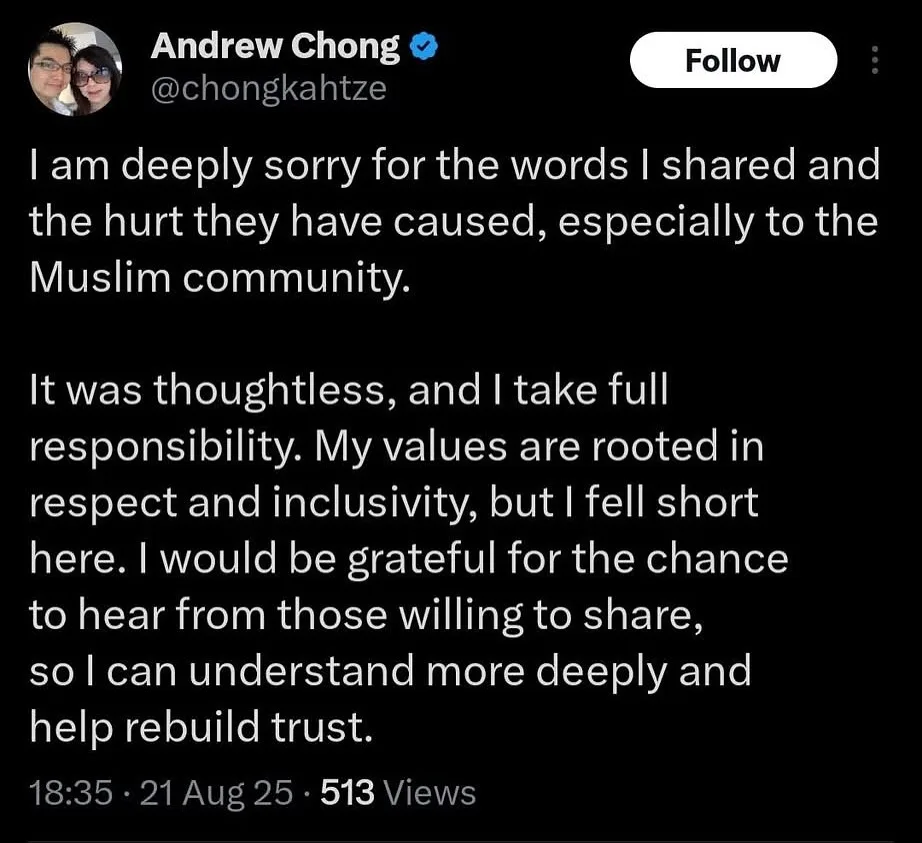 “Chong’s post contradicts our values, and we take responsibility for this oversight. We condemn any form of discrimination or disrespect towards religion and stand in solidarity with our Muslim community. To those affected, we extend our sincerest apologies,” the statement read.