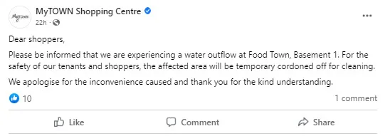 MyTown Cheras has since released a statement on their socials to warn visitors. “Please be informed that we are experiencing a water outflow at Food Town, Basement 1. For the safety of our tenants and shoppers, the affected area will be temporary cordoned off for cleaning,” the post reads.