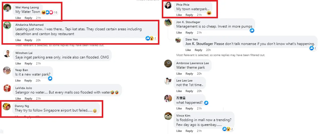 Netizens were quick to add comments to the video. “Water theme park,” one read, with another punning the mall’s name into “My Water Park“. “Management is so cheap,” another criticised. “Invest in more pumps.” One comment quipped: “They tried to follow Singapore airport but failed…” Others pointed out that this was not the first time it had happened. Many also took to the comments to ask what happened.