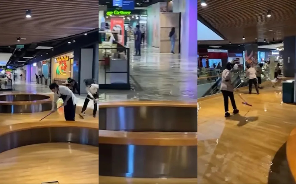 Yesterday, Malaysia Shopping Mall uploaded a video to their socials showing the flooded mall. Staff were seen attempting to remove the water by running a squeegee over the floor. The video also showed a large amount of water collected on the tile area.