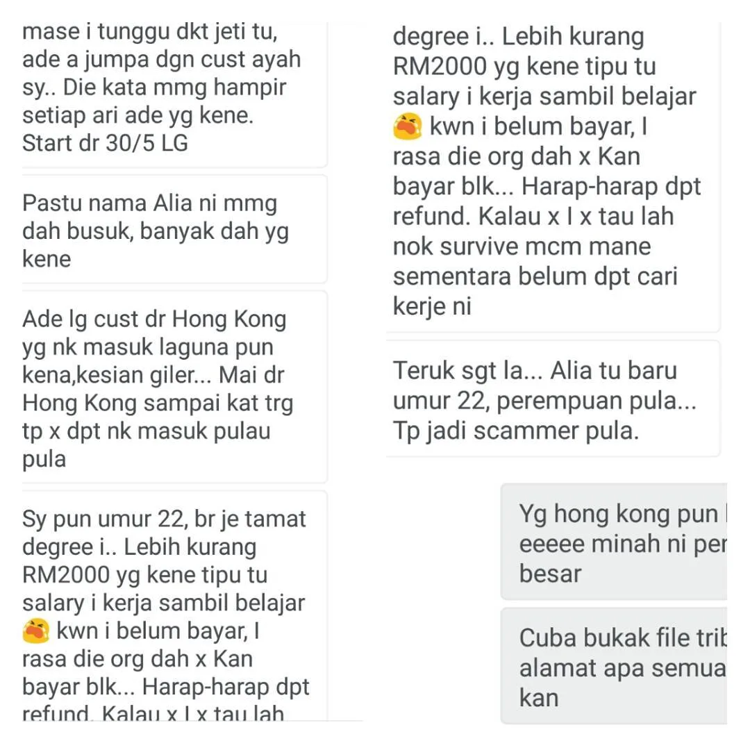 Nur Rosamimie Farisa Mohd Raslan, 30, was also a victim to the scam. She lost almost RM 3,000 after she and 11 family members and employees paid for a 3-day-2-night trip to Pulau Redang.