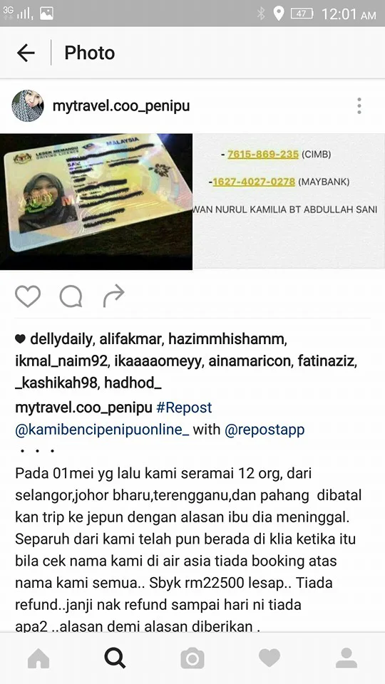 Some victims have since created the Instagram account “mytravel.coo_penipu” to alert travellers about the scam. The account is currently active with 14,400 followers and 68 posts, but it is set as private.