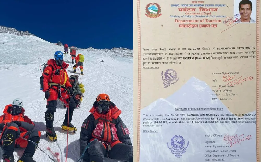 On 12th May this year, N. Elanghovan had conquered Mount Everest, being the oldest Malaysian to reach the peak of the mountain. Proud of his accomplishment, the mountaineer had showed his certificate, issued by the Department of Tourism of Nepal’s Ministry of Tourism, Culture and Civil Aviation, as a verification of his 8, 849-metre-climb to the top.