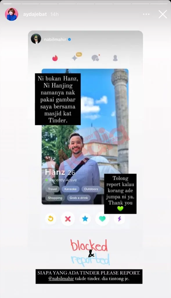 Nabil’s beloved partner, Ayda Jebat, was also seen reposting the same message on her Instagram account, saying, “Anyone who is on Tinder, please report the account. @nabilmahir doesn’t have a Tinder account, he’s only ‘Ting Tong’ (crazy).”