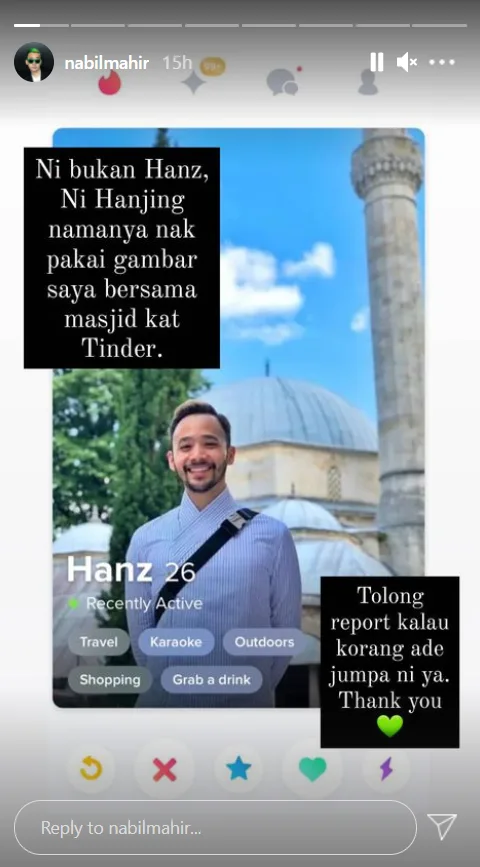 Seemingly dismayed by this, he urged his followers to take immediate action against the individual if they come across the fake profile. “This is not Hanz, but (a) Hanjing (doggo) who used my photo in front of a mosque on Tinder. Please report if you come across this account. Thank you,” the former “H Live” host wrote on his Instagram Story update over the weekend.