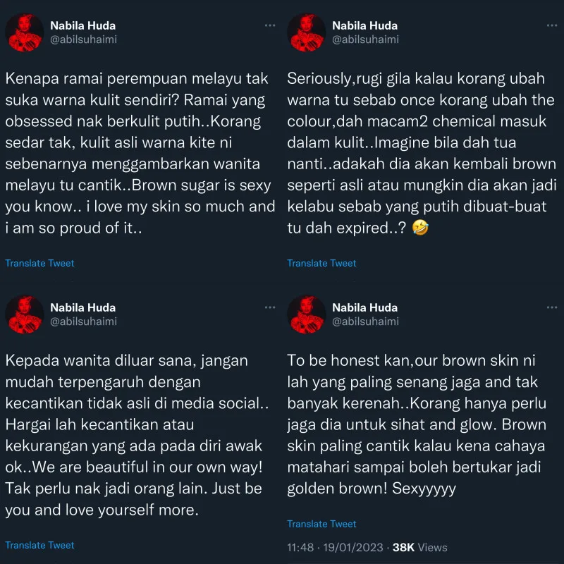 Malaysian actress Nabila Huda is not one to stay silent on an issue that’s important to her. Yesterday (Thursday, 19th January), the actress took to Twitter to express some of her opinions regarding Malay women who are obsessed with whitening their skin to become fairer. “Our natural skin colour shows our true beauty. Brown sugar [skin colour] is sexy you know. I love my skin so much and I am so proud of it,” she tweeted.