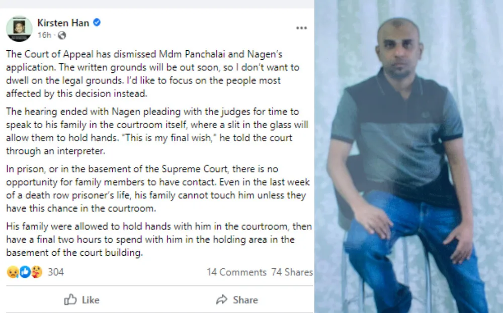 Freelance journalist Kirsten Han had been present when Nagaenthran’s final appeal was rejected. She shared that Nagaenthran had pleaded with the judges for time to spend with his family while they were still in the courtroom. “This is my final wish,” he told the court. Kirsten added that this was his family’s only chance to hold him and they could only do so via a slit in the glass screen. As they held hands, the family wept while Nagaenthran repeatedly cried, “Ma“. They also got to spend a final two hours with him in the basement holding area of the court building.