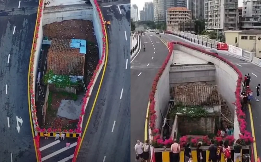 Negotiations eventually broke down and the government was forced to build around her. As a result, Ms. Liang’s little house is now sandwiched between two major roads. Some have dubbed the spot as “Eye of the Pearl” as the shape reminds them of a human eye. Many have also stopped by to visit the little house, which can be accessed by a route leading under the bridge.