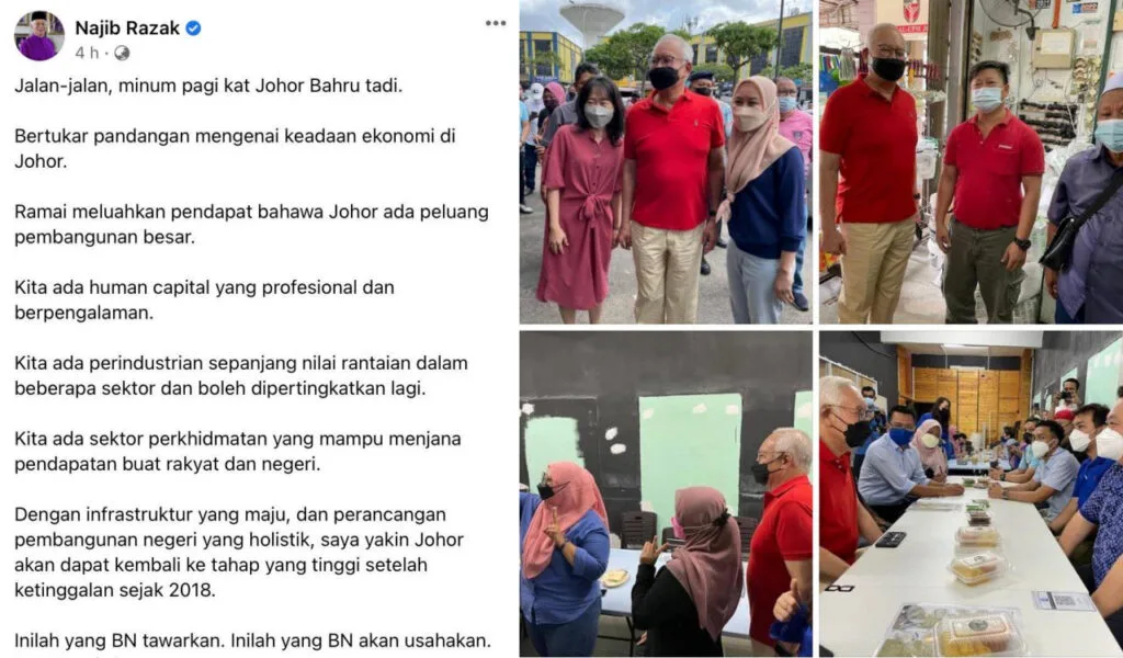 In his next posting, Najib also showed several photos of him around the streets in Johor Bahru. According to him, “Exchanging views and opinions regarding the economic situation in Johor. Many revealed that the state has great development opportunities.”