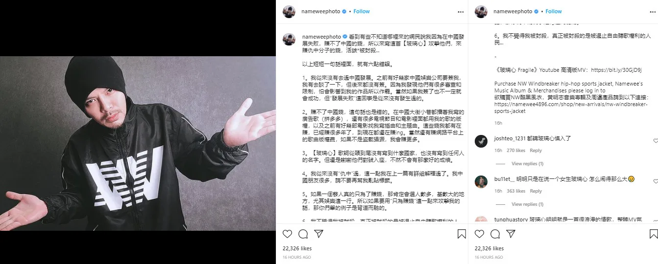 Namewee’s earlier social media post touched on a few issues, but as always, the netizens have been unrelenting. Their most recent argument was that “Fragile” was written in retaliation against China. Apparently, Namewee’s career had failed to take off in the country, hence his need to write the song. Netizens also accused Namewee of using the song to “make money off the Chinese” and said he “deserved to be (banned)”. Needless to say, the Malaysian rapper was less than impressed.