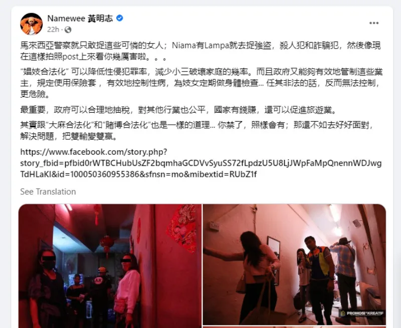 After news of the arrest broke out, Malaysian rapper Namewee took to Facebook to criticise DBKL for prioritising catching only sex workers rather than those he considers actual criminals. “The Malaysian police only dare to catch these poor women. Go catch robbers, murderers, and fraudsters, and then take photos and post them up to show how good you are,” he wrote.