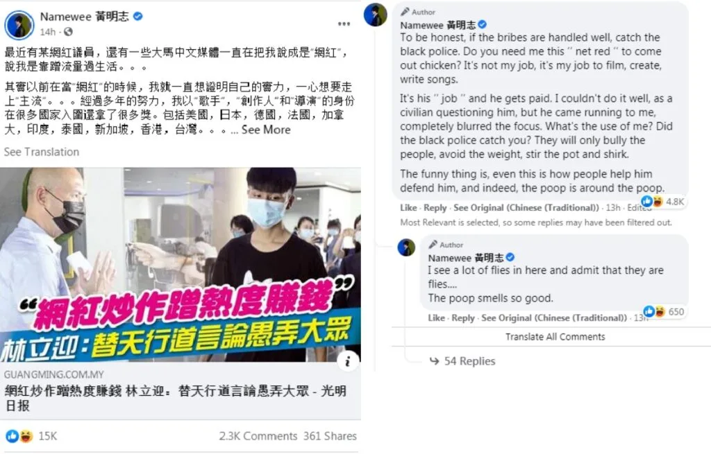 The rapper was quick to respond to Lim’s remarks on Facebook. He stated he was not an ‘internet celebrity’. He has already made a name for himself globally as a singer and director. Namewee added that even if he was an internet celebrity, helping people was not “his job”. “It’s my job to film, create (and) write songs,” he quipped. “(Helping people) is (Lim’s) “job” and he gets paid.”