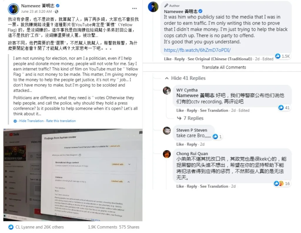 On 17th June, the oldest hawker (21) supposedly decided to retract his statement about the blackmail. According to reports, he had not informed MP Lim of the change. Namewee, who had heard of the case, suspected something was wrong. He followed up with the hawker and announced his interest in offering financial help. He later reported on Facebook that “it was as he suspected”. Additionally, he alluded that he would later reveal some ‘content’ that would help the hawker.